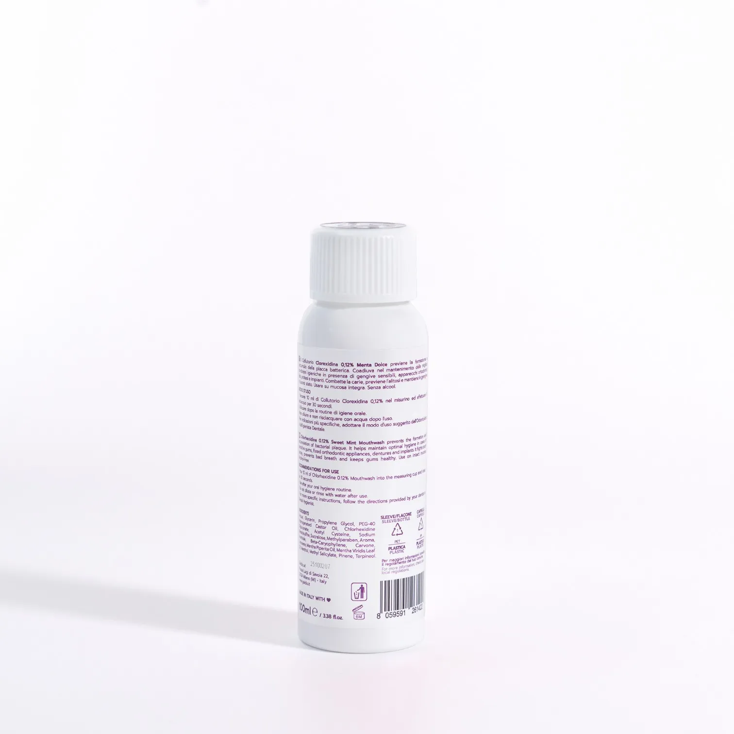 Apa, glicerina, propilen glicol, ulei de ricin hidrogenat PEG-40, digluconat de clorhexidina, acetilcisteina, metabisulfit de sodiu, sucraloza, metilparaben, parfum, anetol, beta-cariofilen, carvona, limonene, mentol, ulei de menta creata, ulei din frunze de menta creata, salicilat de metil, pinen, terpineol.